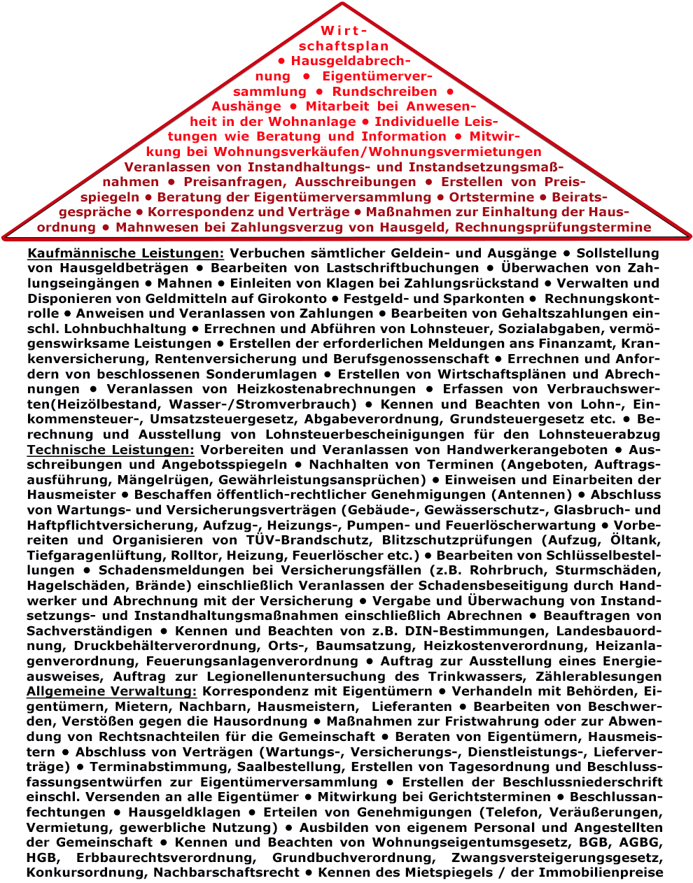 Meine Leistungen • Als Gebäudeverwalterin braucht man Einfühlungsvermögen, ein „offenes Ohr“ für die Belange der Eigentümer, Durchsetzungsvermögen und viel bautechnisches Wissen. • Individuelle Betreuung- Meine Eigentümer kenne ich persönlich! • Wenig Objekte und dadurch mehr Zeit für die Betreuung- deshalb auch schnelle Reaktionszeit • Wissen in sämtlichen Gewerken durch eigene Bauerfahrung • Auch nach der Eigentümerversammlung immer wieder Informationen über den Entwicklungsstand der Immobilie durch E-Mail-Versand an die Eigentümer (wird vor allem von Auswärtigen geschätzt!) • Wert auf Ästhetik beim Austausch von Gebäudeteilen wie z.B. Fenster und Türen- denn vor allem die Optik eines Objekts entscheidet über den späteren Wiederverkaufswert • Sparsames Haushalten, als ob es um eigene Ausgaben ginge • Ich helfe Ihnen gerne, eine Hausmeisterbetreuung zu finden oder wenn Sie Gemeinschaftsaufgaben, wie z.B. den Winterdienst oder die Kehrwoche in fremde Hände geben möchten. • Keine festen Bürozeiten, immer zu erreichen. Das sieht der Eigentümer Einen tieferen Einblick in die Verwaltungsaufgaben bekommen die Verwaltungsbeiräte Diese Leistungen sieht der Eigentümer nicht